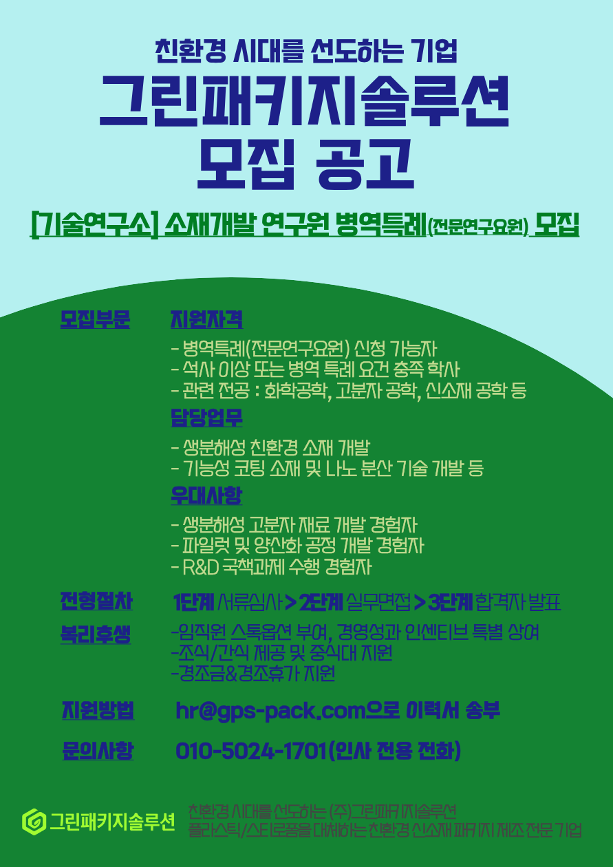 (주)그린패키지솔루션 소재개발 파트 병역특례(전문연구요원) 채용공고