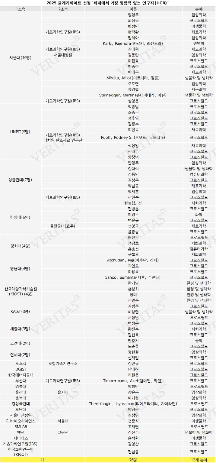 [출처(베리타스알파, phs@veritas-a.com): 2025 ‘세계에서 가장 영향력 있는 연구자’ 서울대 16명 ‘증가’ 톱.. UNIST 성대 한대 경희대/영남대/KIOST 톱5 < 세계대학 평가 < 대입잣대 < 대입 < 기사본문 - 베리타스알파]