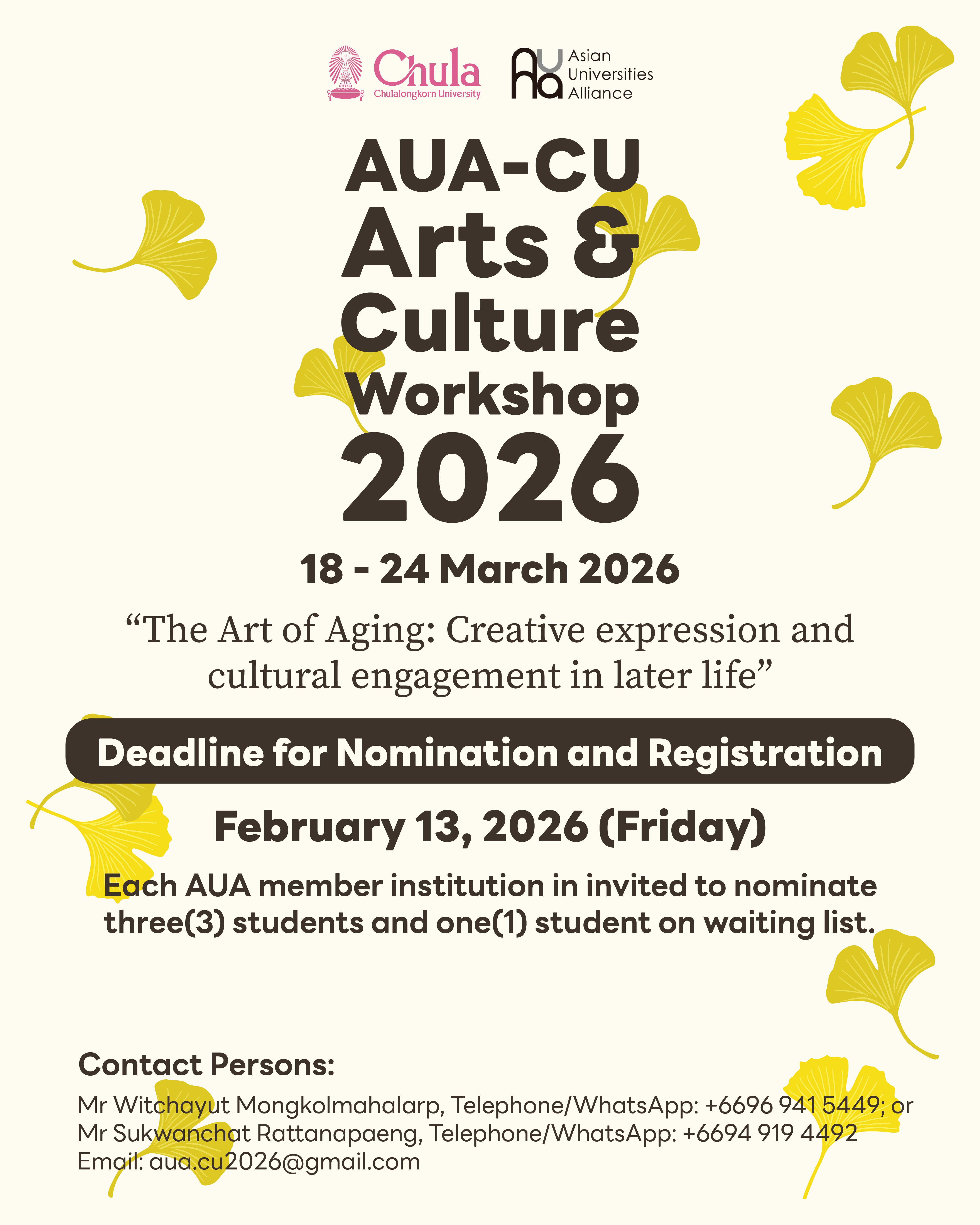 아시아 대학연맹(AUA)과 태국 출라롱콘대학에서 진행하는 ⌜AUA-CU Arts&Culture Workshop Camp 2026⌟ 참가자를 아래와 같이 선발하오니